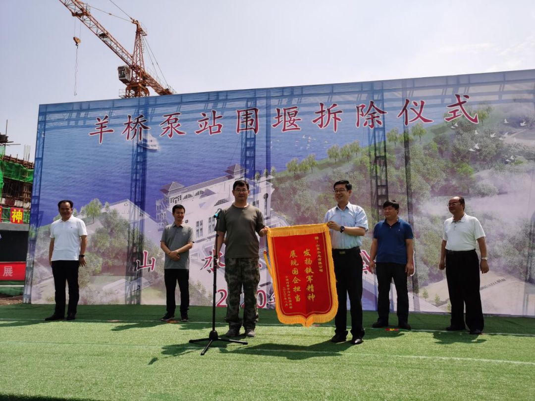 羊桥泵站闸门完全具备了启闭功能,水泵具备了排水功能,围堰的拆除标志着羊桥泵站的正式启用,为今年防汛防潮排涝提供了工程保障,对保证羊口镇人民生命财产安全具有重要意义。仪式上,王法顺部长代表工程指挥部给J9九游会·(中国)首页登录入口授予了锦旗,表达了对J9九游会·(中国)首页登录入口领导及参建职工的感谢,赞扬了水总人自强不息、勇于超越的铁军精神。