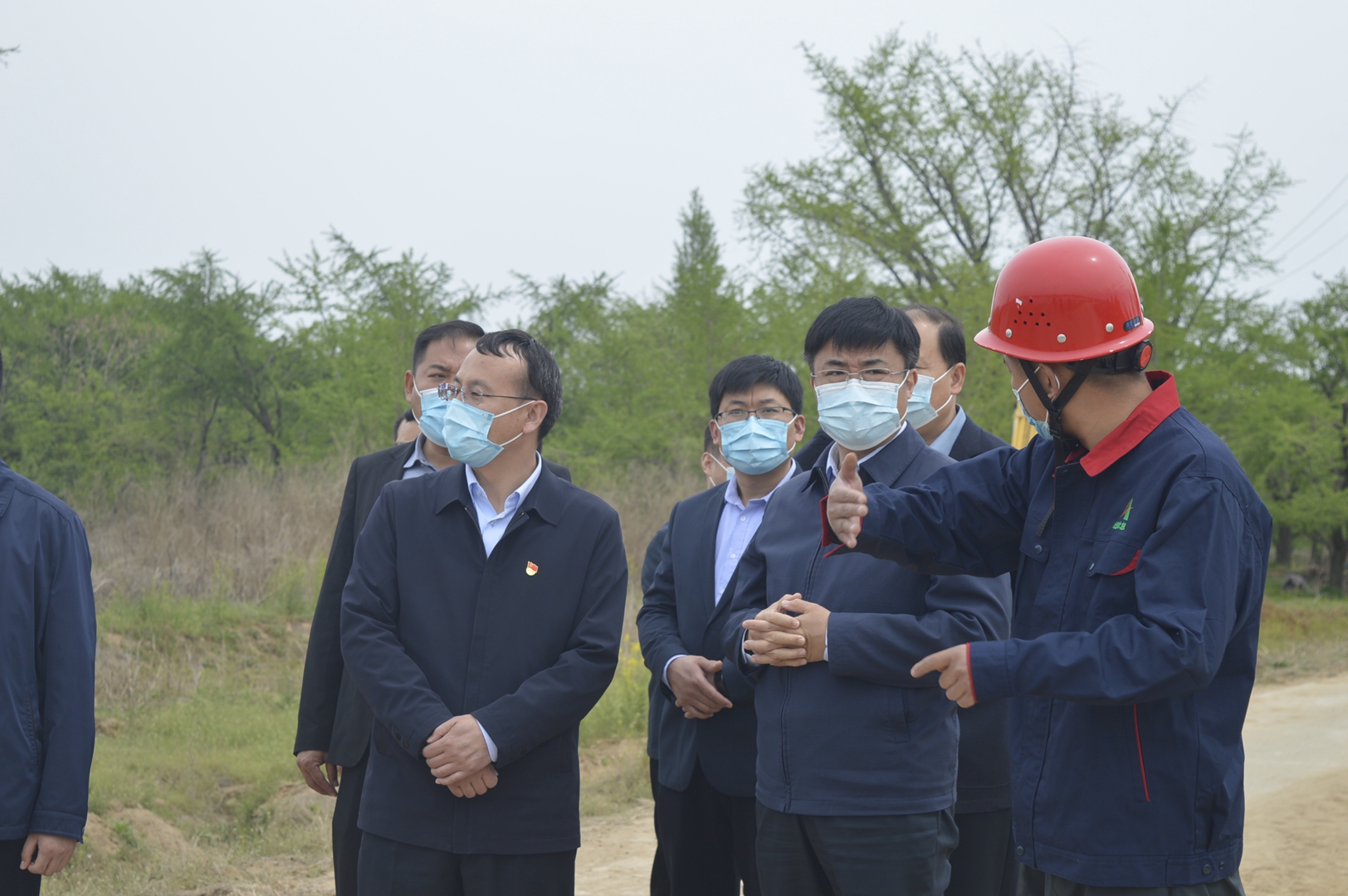 4月14日,临沂郯城县县委书记王立军一行到山东水总第三分J9九游会·(中国)首页登录入口承建的重坊橡胶坝工程视察指导工作。通过项目经理王庆捷的工作汇报,王立军详细了解了项目部疫情防控、复工复产情况以及当前工程面临的重点难点问题。