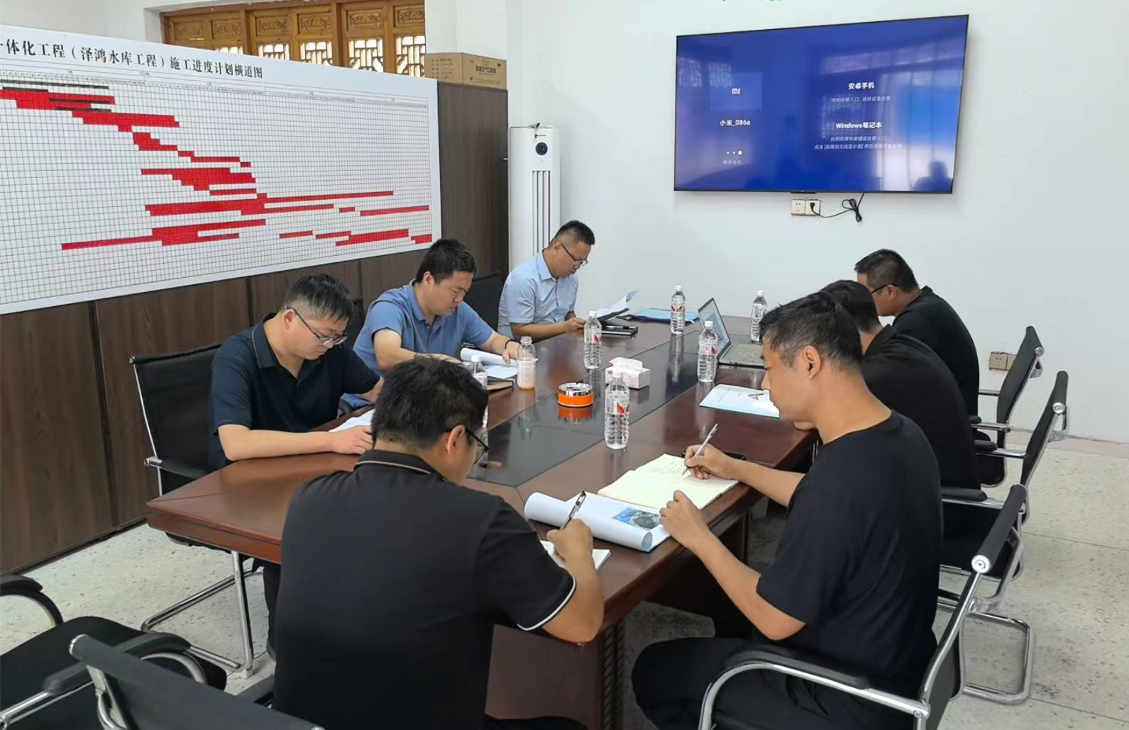 靳文硕一行查看了项目施工现场,详细了解了项目进展情况,针对现场存在的问题,要求项目部及时作出整改。召开了座谈会,听取工程进度、营收计划、招标采购情况以及存在问题等方面的工作进展情况。靳文硕要求,一是针对项目进度情况制定赶工计划,并做好安全保障工作;二是针对合同条款中产值落地等条款进行深入探讨,及时制定可行方案,尽快完成招采工作;三是项目部管理人员要加强对项目进度、质量、安全文明施工的管理,增强责任意识,打响山东水总金字招牌,展现山东水总管理水平与企业担当,进一步开拓四川市场